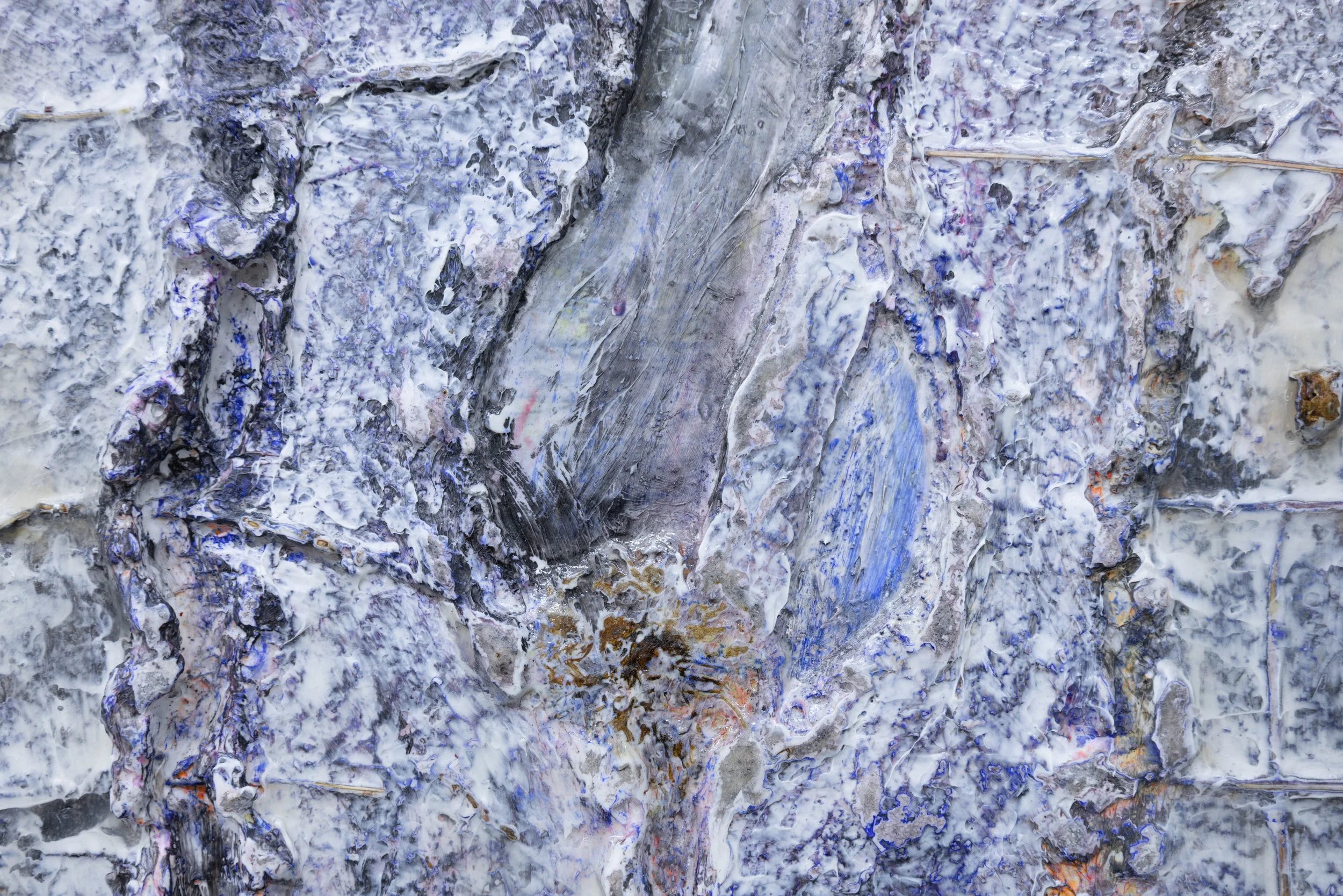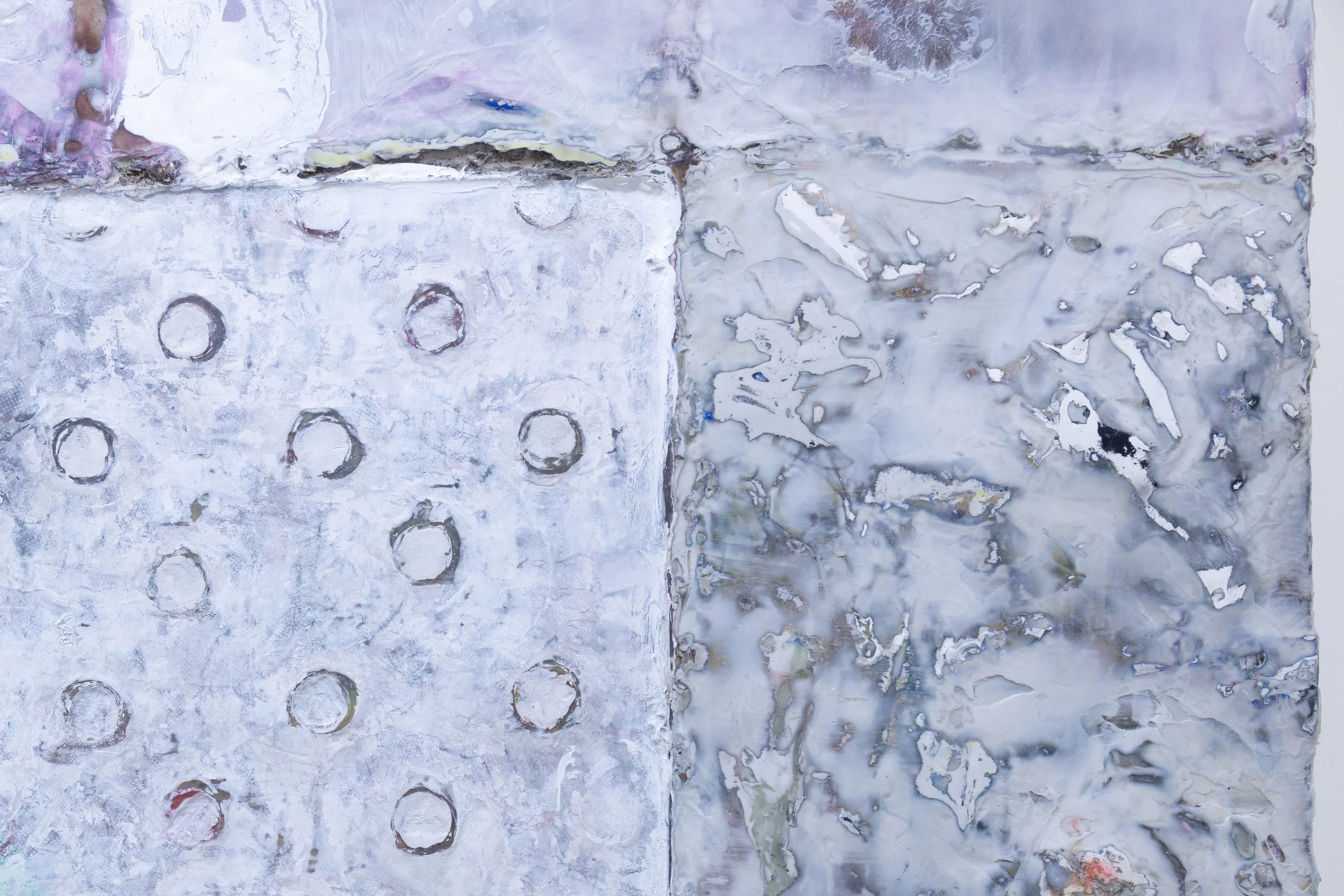 Now, these surfaces echo pavement, concrete, rebar, skin, Play-Doh, static screens brought to life through accumulative textures and marks. Kneading, patching, mending—returning, returning, returning. They live as residue and record. They are generous. They hold secrets. They offer a space to consider what it means to preserve something, not forever, but for now.