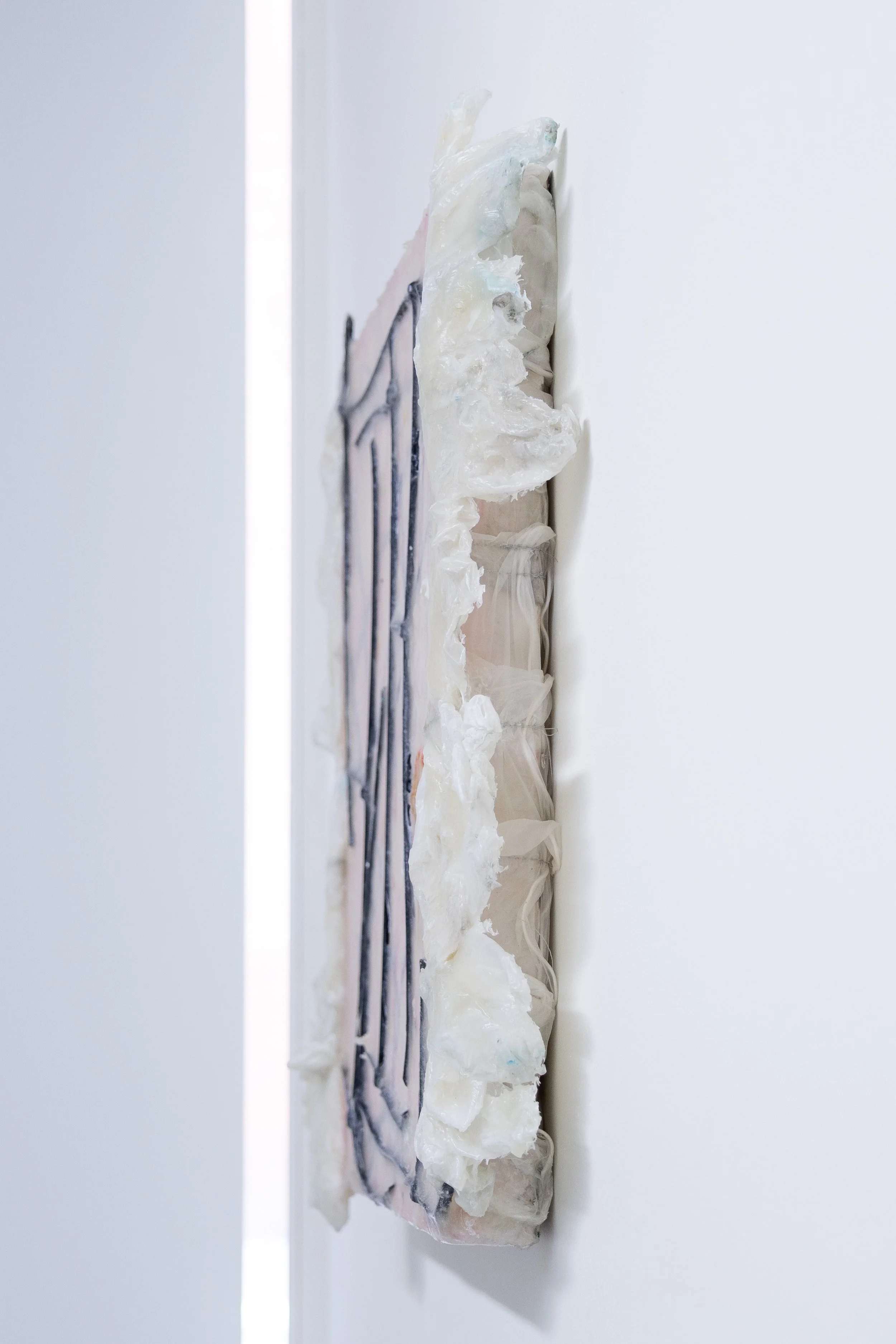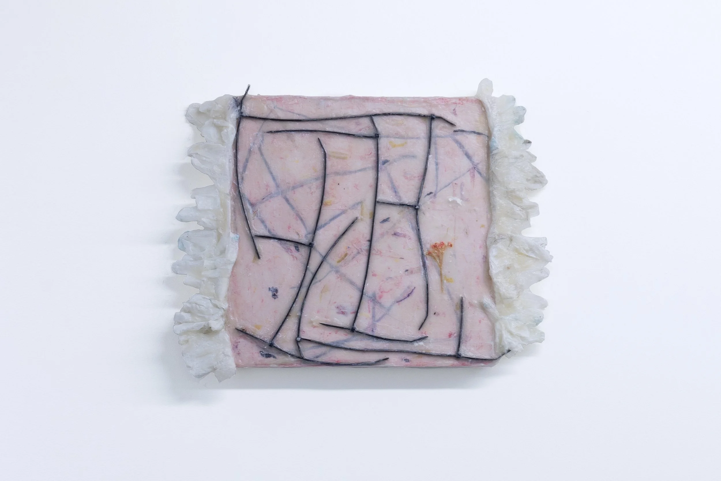 The works in Call Me Superstitious are embedded with flowers given by friends and past lovers, gloves left behind in the studio, zip ties cut from what they held, bingo cards from a summer spent hoping to win. The residue of lived experience is woven into the structure. These works are about cracks, both physical and emotional: in the systems, in the grids, in the hearts, in the sidewalks—the ones we were told to step over.